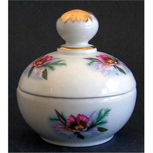 This very pretty powder or dresser jar features hand painted flowers both on the base and lid as well as a giltfinial and trim. Marked on the bottom LIMOGES FRANCE with a DC inside a triangle. Measuring 4" tall x 3 1/2" across the rim with both the lid and jar in excellent condition.