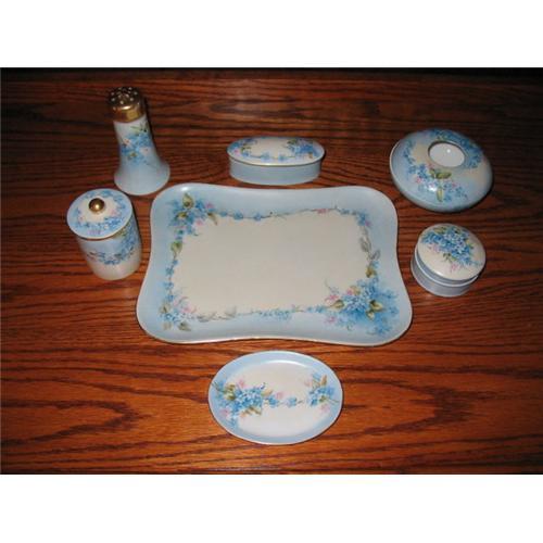 RARE AND GORGEOUS MATCHED SEVEN PIECE HAND PAINTED ARTIST SIGNED LIMOGES DRESSER SET. THIS IS A STUNNINGLY BEAUTIFUL EARLY SET THAT IS DECORATED WITH LOVELY BLUE FORGET ME NOTS. EACH PIECE IS MARKED WITH THE INITIALS OF THE ARTIST (F.L.H.)AND IS IN EXCEPTIONALLY GOOD CONDITION. WILLIAM GUERIN MARK #2 IN GREEN UNDERGLAZE ON PIECES WHICH ARE MARKED DATES THE SET TO THE PERIOD 1891-1900. THIS IS A GREAT EXAMPLE OF THE HAND PAINTED ERA WHICH ROUGHLY SPANNED THE PERIOD 1890-1915 AND TO FIND A COMPLETE SET IN PRISTINE CONDITION IS RARE. DRESSER TRAY MEASURES 9.75" BY 7.25". NO CHIPS CRACKS OR REPAIRS. SET INCLUDES TRAY, TALCUM POWDER SHAKER, HAIR RECEIVER (AUSTRIAN MARK), PIN TRAY,