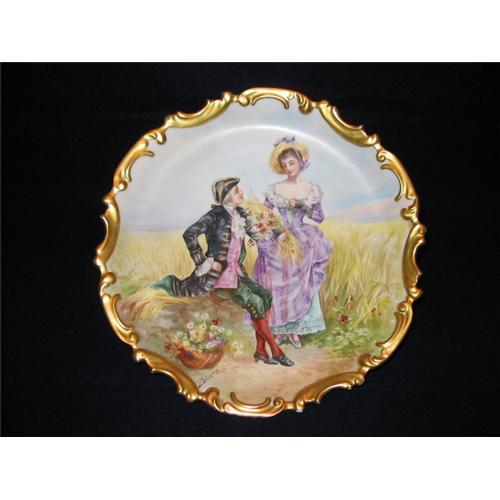 BEAUTIFUL AND RARE 13" HAND PAINTED LIMOGES PLACQUE BY FAMOUS FRENCH STUDIO ARTIST DUBUOIS. THIS ARTIST WAS ONE OF THE FINEST TO PAINT LIMOGES PORCELAIN AND IS ILLUSTRATED NUMEROUS TIMES IN MARY FRANK GASTON'S "COLLECTORS ENCYCLOPEDIA OF LIMOGES PORCELAIN" AS WELL AS DEBBY DUBAY'S "ANTIQUE LIMOGES AT HOME". THIS PLACQUE FEATURES A COURTSHIP SCENE WITH MAGNIFICENT COLOR AND DETAIL. LIMOGE FRANCE MARK #8 OVERGLAZE DECORATING OR EXPORTING MARK IN BLUE. NO CHIPS CRACKS OR HAIRLINES AND A SLIGHT AMOUNT OF GOLDWEAR. ABSOLUTELY BEAUTIFUL ARTWORK!