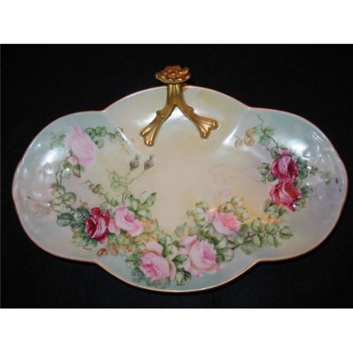 A STUNNINGLY BEAUTIFUL HAND PAINTED ARTIST SIGNED (M.E. MILLAN) LIMOGES TRAY. THIS GORGEOUS PIECE DATED 1911 IS DECORATED WITH BEAUTIFUL CLUSTERS OF VARIOUS SHADES OF ROSES. ALL THE GOLDWORK IS THERE ON THE TRIM AND SPLIT CENTER HANDLE WHICH FEATURES A FLOWER ON TOP. IT MEASURES 11" BY 6". WM. GUERIN LIMOGES MARK #3 IN GREEN UNDERGLAZE. NO CHIPS CRACKS OR HAIRLINES. MINT CONDITION! THIS TRAY IS FEATURED IN MARY FRANK GASTON'S COLLECTORS ENYCYCLOPEDIA OF LIMOGES (3RD ED.) ON PAGES 142-143.