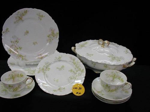 LIMOGES HAVILAND & CO. inTHE BRETAGNEin INCLUDES (1) 11in OVAL COVERED CASSEROLE W/BOW HNDLS. (W/HAIRLINE SPIDER), (2) 9 5/8in PLATES (W/EDGE CHIPS) #20734, (1) 7 1/2in BREAD PLATE (W/FLAKE), (4) SAUCERS (W/EDGE CHIPS), (2) CUPS (1 W/FLEA NIP), 10 PCS.