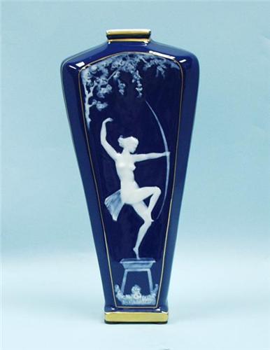 LIMOGES - MARCEL CHAUFRIASSE. "Barbotine". A French pate-sur-pate porcelain vase. The flat trapezoid shaped vessel with blue ground decorated with pate-sur-pate figural motifs. Signed on front. Titled and hallmarked underside. 12 1/2" high. Circa 1920.