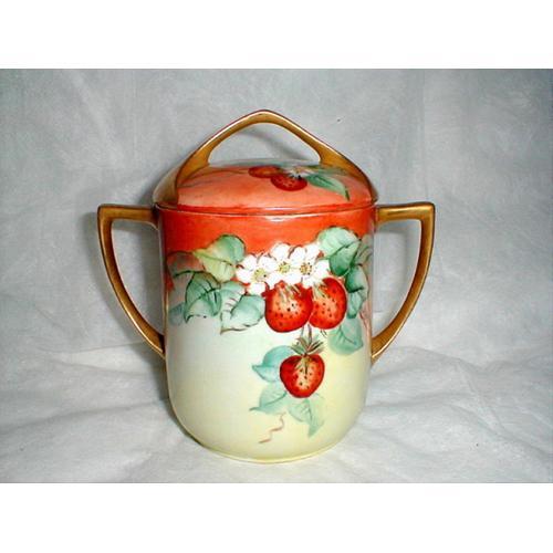 EXCELLENT VINTAGE MILK CONTAINER THAT IS NOT MARKED BUT HAS THE LOOK AND FEEL OF FINE LIMOGES PORCELAIN. THIS HAND PAINTED CONTAINER HAS STRAWBERRIES WITH GREEN LEAVES AND GOLD HANDLES AND GOLD FINIAL AND IS ARTIST SIGNED. THIS PIECE MEASURES 6 IN. TALL TO INCLUDE THE COVER AND 6 IN. WIDE FROM HANDLE TO HANDLE AND IS IN VERY GOOD CONDITION WITH NO CHIPS, CRACKS, OR REPAIRS.