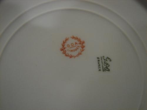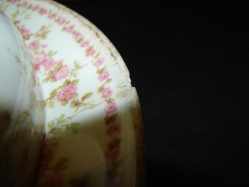 GERARD, DUFRAISSEIX & ABBOT LIMOGES (1937-1976) PORCELAIN PANCAKE DISH WITH LID. Pink transfer floral decorated with gilt band decoration around border of plate and lid and at ribbon form handle at top of lid. Marked on bottom. Shows loss to gilt and o