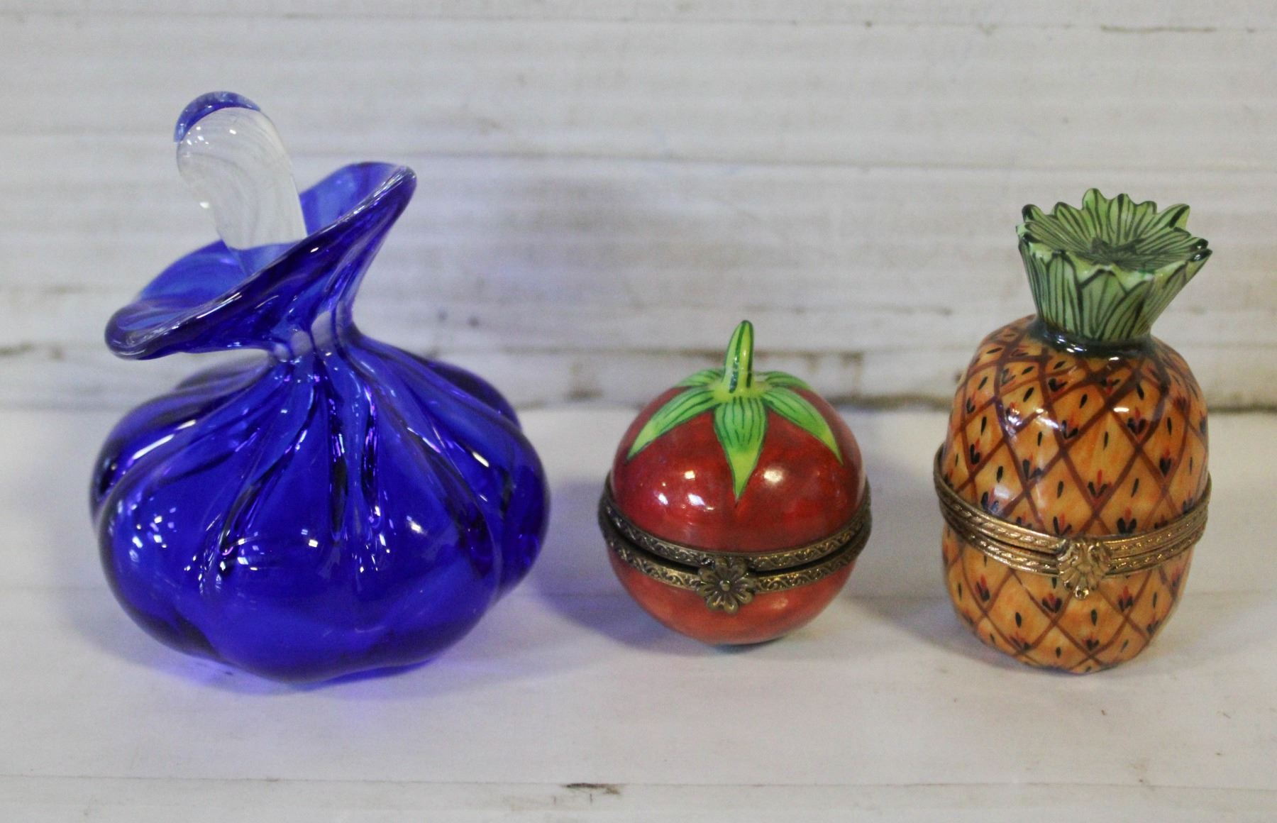 PLUS JOHN PHILLIPS ART GLASS PERFUME BOTTLE, ALL 3 ITEMS ARE VINTAGE & SIGNED, ALL TOGETHER IN A GIFT BOX