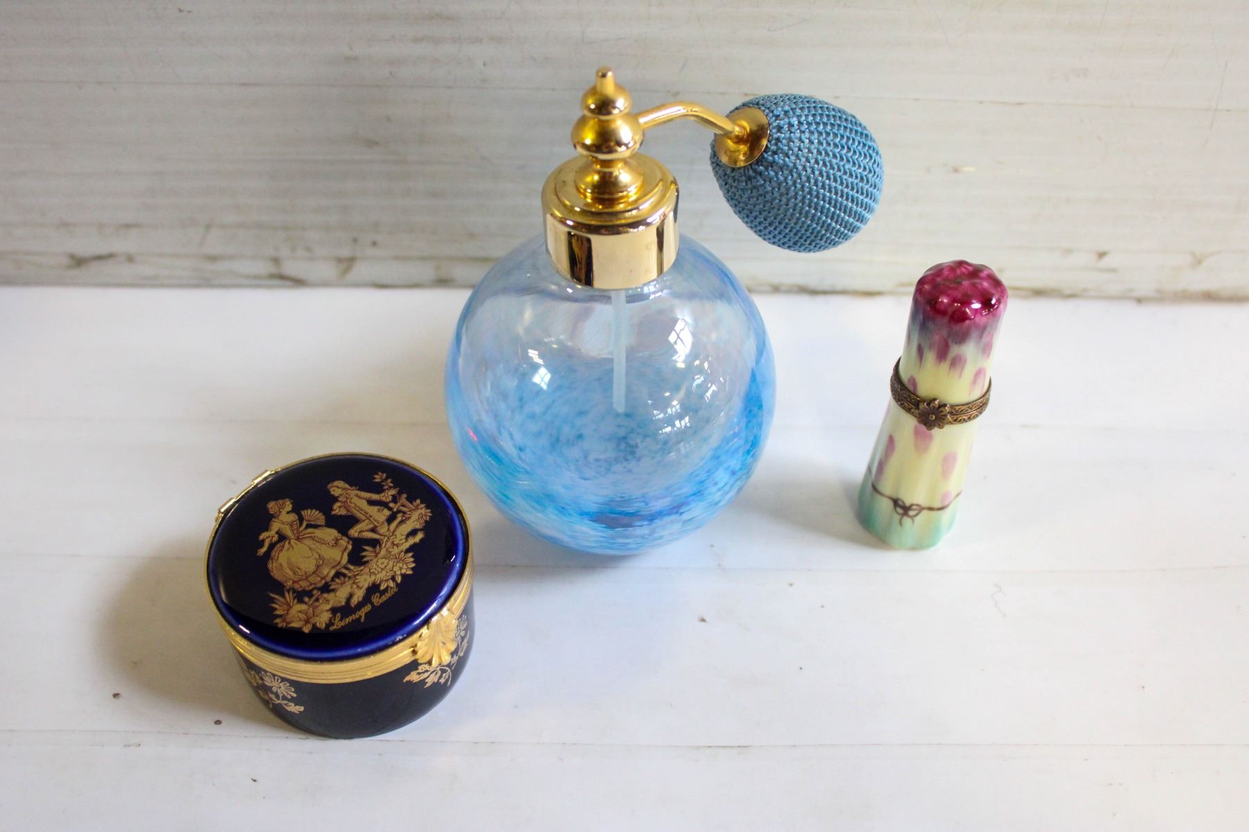 PLUS CAITHNESS SCOTLAND ART GLASS PERFUME BOTTLE & LIMOGES CASTEL PORCELAIN 22K GOLD ACCENTS TRINKET BOX, LIMOGES ITEMS SIGNED, ALL ITEMS VINTAGE, ALL TOGETHER IN A GIFT BOX