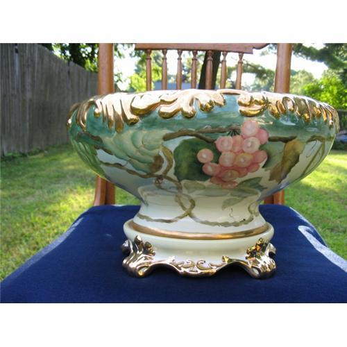 LARGE J.P. LIMOGES PUNCH BOWL WITH GRAPES ON A PEDESTAL. BOTH PIECES HAVE THE SAME J.P. LIMOGES MARK. PUNCHBOWL MEASURES 14.5" IN DIAMETER AND IS 7" HIGH (8.5" WITH PEDESTAL) THERE ARE NO CHIPS CRACKS OR HAIRLINES AND THE GOLD IS PLENTIFUL AND ALMOST NO WEAR. THERE IS A ROUGH SPOT ON THE VERY BOTTOM OF THE BOWL (NOT VISIBLE) WHICH MAY HAVE BEEN MADE DURING MANUFACTURING AT THE FACTORY OR A PROFESSIONAL REPAIR. IT DOES NOT DETRACT IN ANY WAY FROM THE