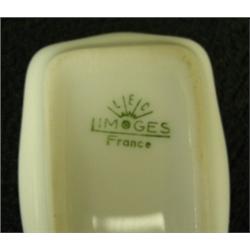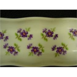 Limoges hat pin tray. Turn of the century porcelain with purple floral motif. 2" x 8.5". Marked L E C Limoges, France. Condition: Excellent