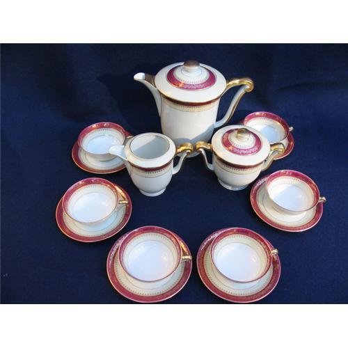 ELEGANT AND DELICATE ANTIQUE B & CO LIMOGES TEA SET IN FABULOUS CONDITION. SET INCLUDES LARGE TEAPOT (8.25" HIGH AND 9"HANDLE TO SPOUT) SUGARBOWL 5" HIGH AND CREAMER 4.5". THIS SET ALSO INCLUDES 6 CUPS AND SAUCERS. THE PATTERN IS CRANBERRY ON AN IVORY CREAM COLOR WITH LAVISH GOLD DECORATION. EVERYTHING IS IN TOP CONDITION INCLUDING GOLD AND NO CHIPS CRACKS HAIRLINES OR REPAIRS. WONDERFUL FOR GIFT OR FOR SERVING YOUR GUESTS! B & CO FRANCE MARK 1 IN GREEN UNDERGLAZE WITH REYNAUD DECORATING MARK IN BLUE OVERGLAZE.