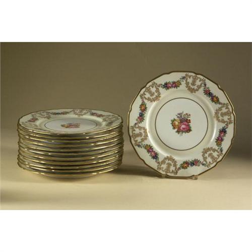 PORCELAIN: Twelve cream color porcelain plates, white center, gold trim,transfer floral swags and gold filigree design, blanks made by T.V., Limoges, France, finished by Tressemanes & Vogt, Limoges France per instructions from and sold by W. H. Plummer & Company, 7 East 35th, New York, New York, a well know upscale merchandise firm, 1891-1907, 11'' each.