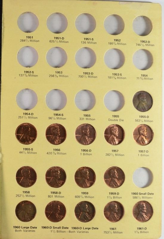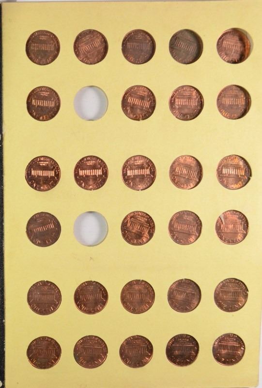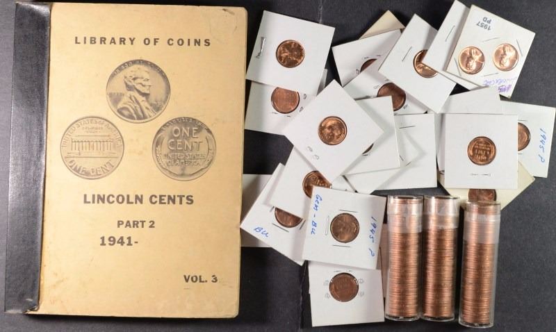 LINCOLN CENTS, PARTIAL SET IN ALBUM, 3 ROLLS 1964 BU, 10 1942 BU, 10 1945 BU