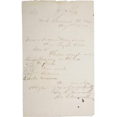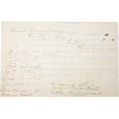 <B>LINCOLN COUNTY WAR, WITNESS KILLING OF BILLY THE KID DOCUMENT 1884</B></I> - Letter signed by Pete Maxwell ordering supplies for the Maxwell Ranch, Fort Summer, New Mexico 1884. Letter to Browne & Manzanares: Ordering supplies. Signed Luz B. Maxwell (Mother) per P. Maxwell. Billy the Kid was at Pete Maxwell's ranch when Garret rode up and entered Maxwell's bedroom. 'Where is Bill?” Maxwell said he was near by. At that moment a stranger entered the room. Garret must have some how recognized him, for he pulled his gun & fired in the dark. Maxwell ran from the room, Garret had already reached the porch. Maxwell walked down the porch to his mother's room & returned with a candle, put the candle on the windowsill & they peered in. We saw the man stretched out - it was Billy. 5”x 8”. <BR><BR><B>Condition: </B></I>Very fine.<BR><BR><b>Shipping:</b> Flat Material, Small (<a target="_blank" href="http://www.heritageauctions.com/common/shipping.php">view shipping information</a>)