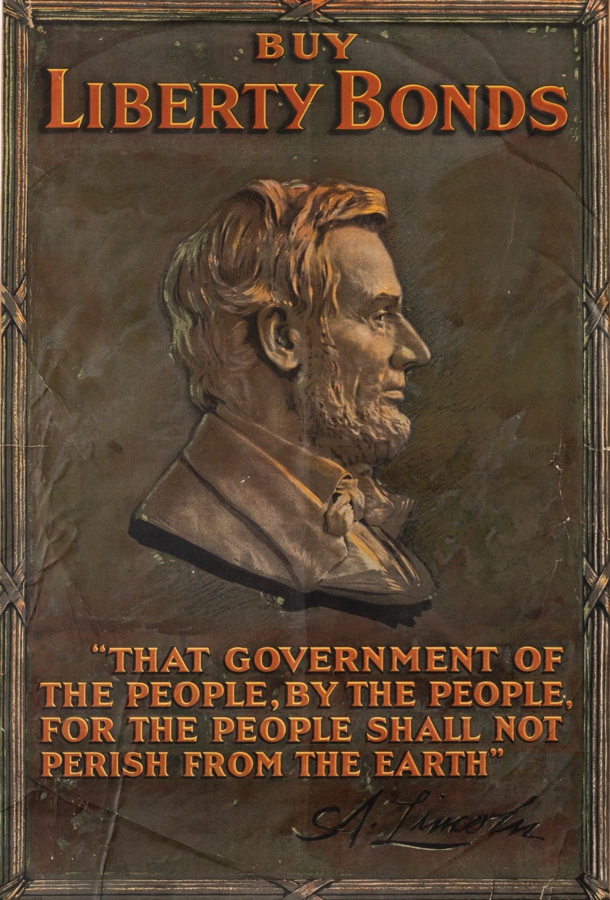 'Buy Liberty Bonds' WWI poster showing a side portrait of Abraham Lincoln and his quote 'That government of the people, by the people, for the people shall not perish from the earth - A. Lincoln.' Mounted to paper, 1917, 30 x 20 inches. Creases and tears on all edges.