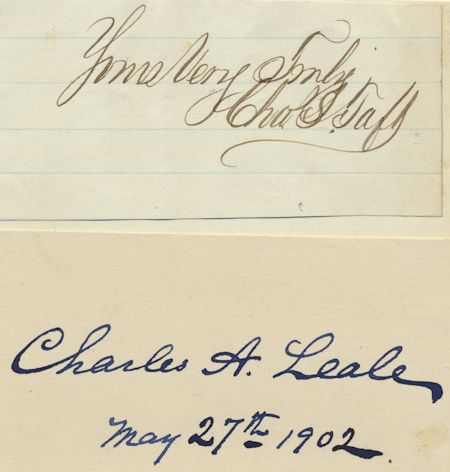 Lot of two signatures of physicians who attended Abraham Lincoln on the last day of his life, includes: CHARLES A. LEALE (1842-1932) Union Army surgeon, the first doctor to be admitted into the presidential box at Ford's Theatre.His assessment of the dire condition of the President, "His wound is mortal; it is impossible for him to recover," was announced to the entire country, signature on a card, 1902; with CHARLES F. TAFT, a surgeon in the audience who was pressed into service and was the second or third doctor on the scene, signature cut from a letter, mounted. Two pieces.