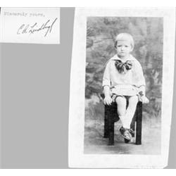 (1902 - 1974) American aviator who, in his "Spirit of St. Louis", was the first to fly solo non-stop across the Atlantic Ocean. Bold signature "Charles A. Lindbergh" on a small slip taken from a letter. Along with a wonderful original vintage photograph, 4" x 6 1/2" sepia, ca. 1905 by Frank E. Edward, showing Lindbergh in a seated pose when he was just three years old. Light scattered foxing to image, overall very good. Two pieces, perfect for display.