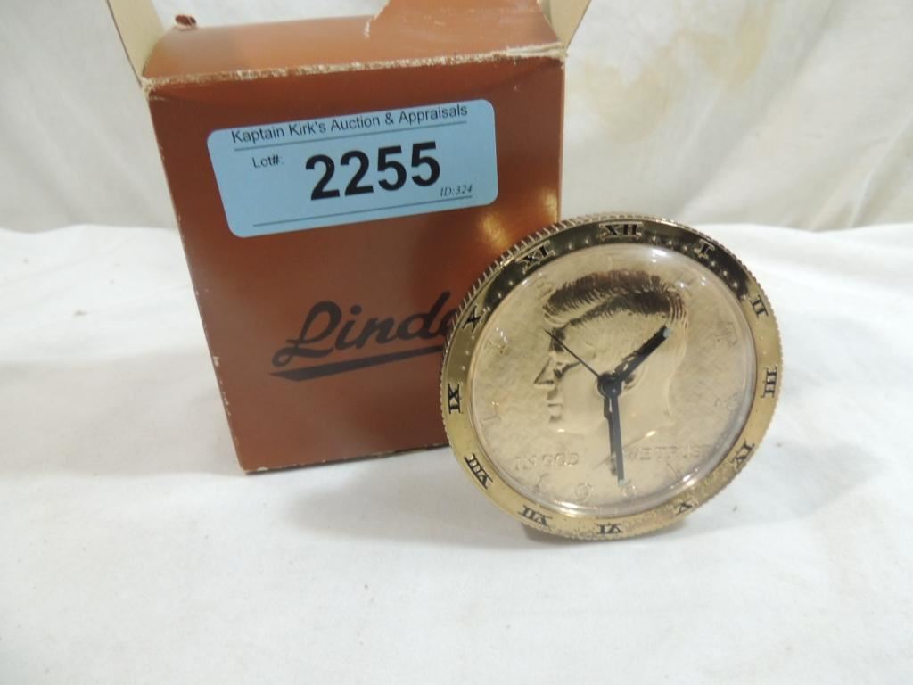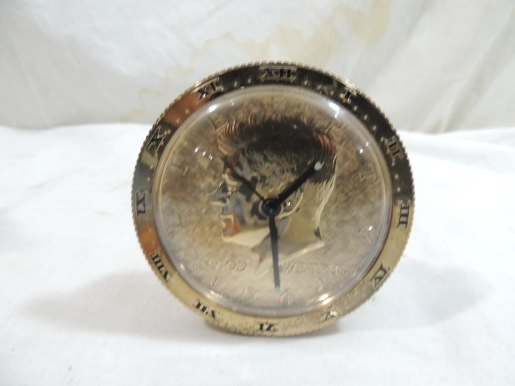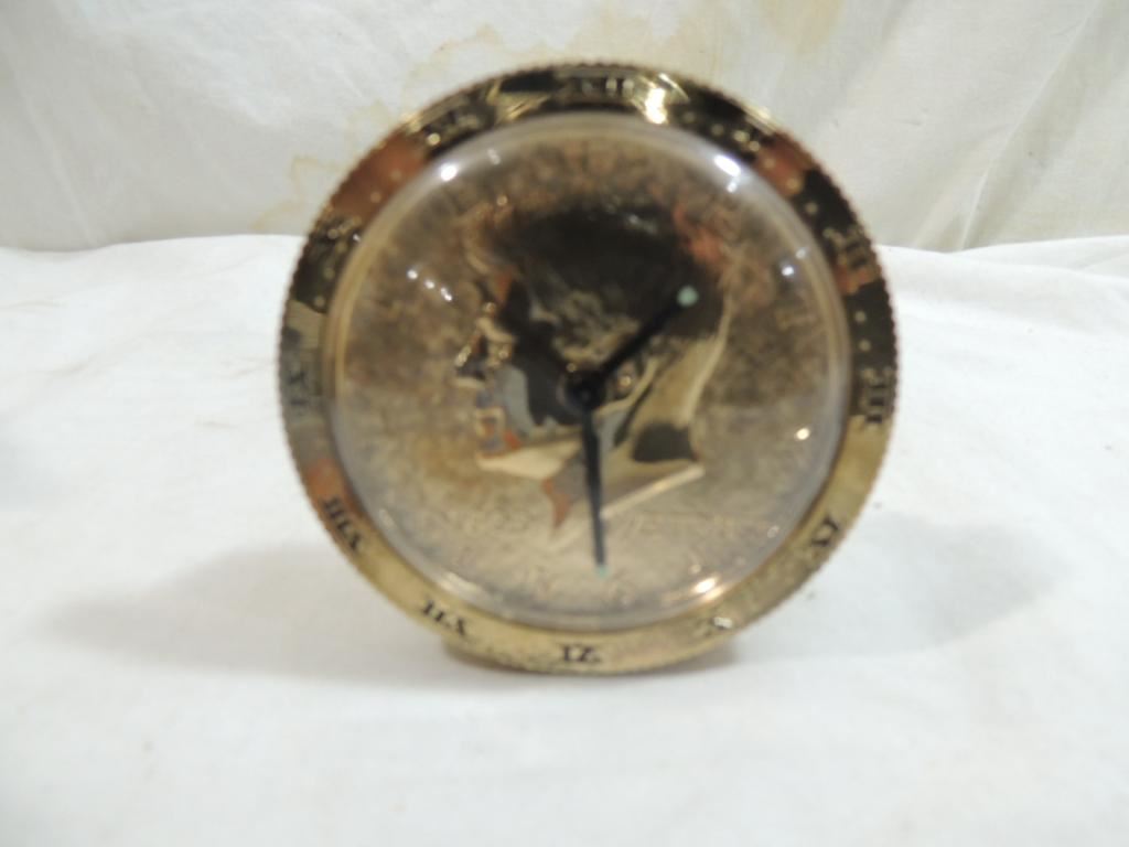 VINTAGE ALARM CLOCK, LINDEN CLOCK, ALARM CLOCK, GOLDTONE KENNEDY COIN CLOCK, AS SHOWN SEE PHOTO FOR MORE DETAILS.