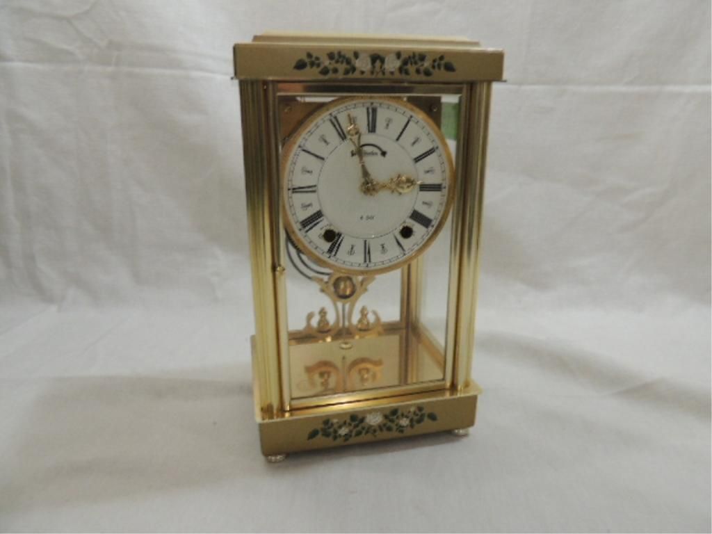 BEAUTIFUL DETIAL CLASS INCASED FLOWER DETAIL. PENDULUM CLOCK. AS SHOWN. SEE PHOTO FOR DETAILS.