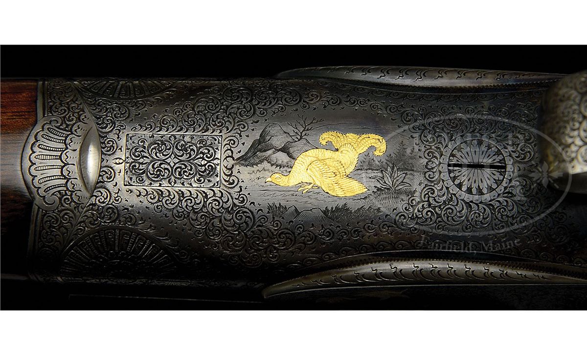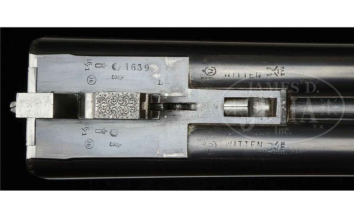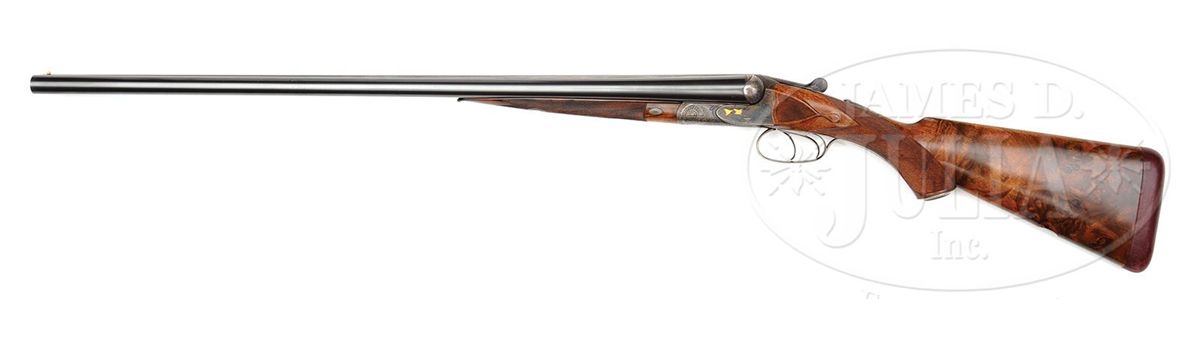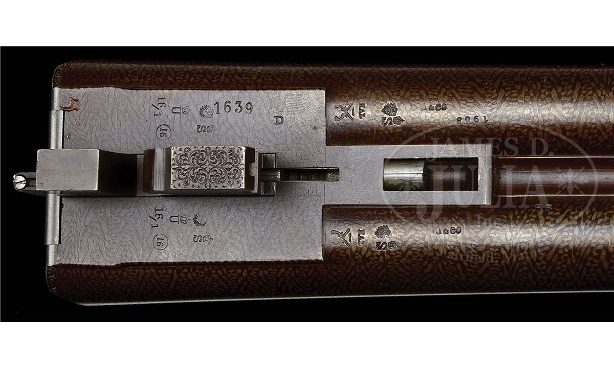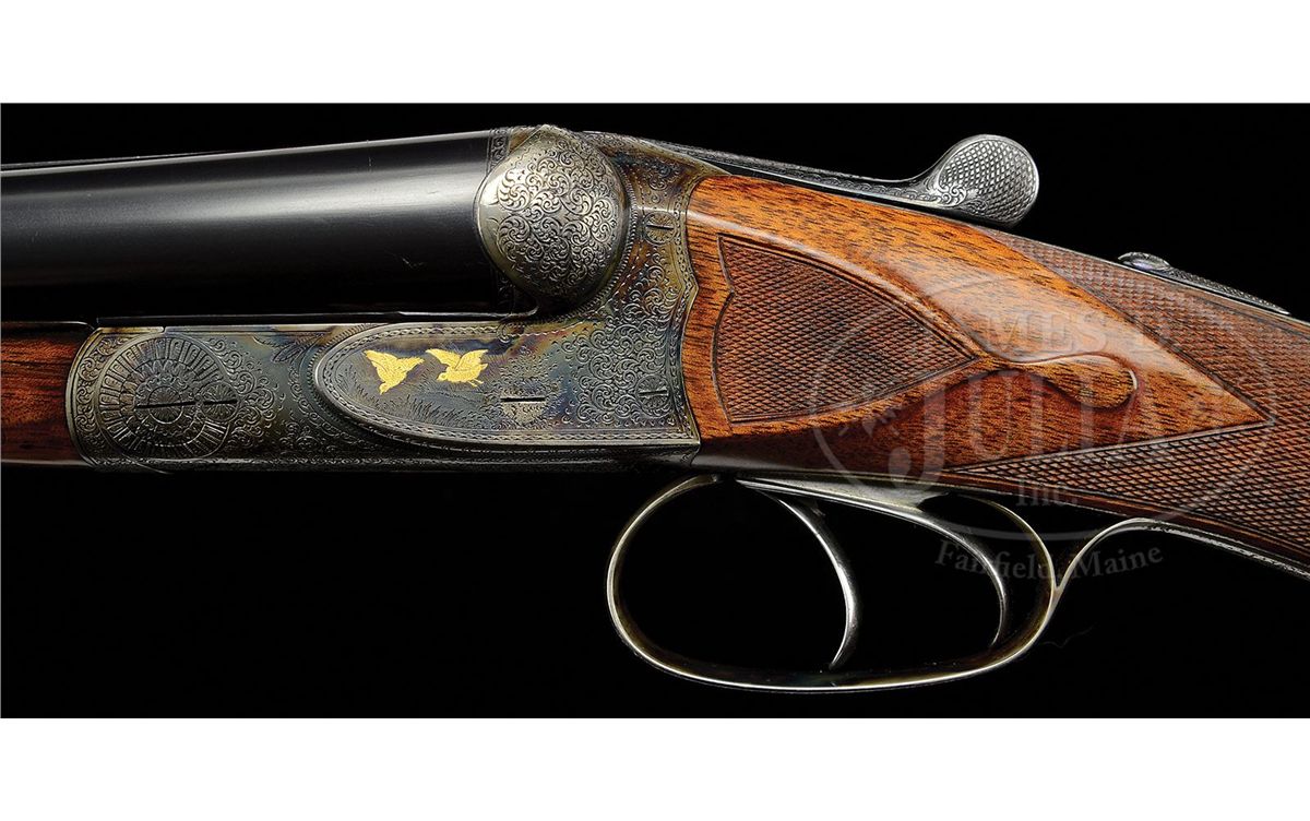 SN 1639. Cal. 16 ga. 2-3/4" Chambers on steel bbls and 2-1/2" chambers on Damascus bbls. 28" Steel and Damascus bbls. Both sets have flat matted pigeon ribs, German imperial black powder proofs on water tables, and "HAL" crossed pistol logos on bottoms. Steel bbls are gold inlaid "Excelsior Steel Witten" in unmatted portion on rib, and Damascus bbls: "Extra Fine Chine Damascus Barrels". Case hardened, scallop-backed boxlock action features side clips, square crossbolt third fastener, intercepting sears, and nickel-plated checkered double triggers. Action is nicely engraved with nearly 70% coverage small scroll. There are gold inlaid vignettes of game in appropriate backgrounds on action; a pair of quail on left, snipe on right, and cock black grouse in courting pose on bottom. A pointing setter is on trigger guard bow. Striking, burl figured European walnut full steel capped pistol grip buttstock measures 14-1/4" over maroon leather-covered pad, and features a vacant silver oval on toe line, point pattern checkering with line borders at grip, and checkered side panels with elongated teardrop points. Splinter ejector forend has scalloped horn tip and Deeley release. Steel bbls: Bore diameter: left-.667, right -.667. Bore restrictions: left -.007 (IC), right -.012 (Light mod). Wall thickness: left -.033, right -.034. Drop at heel: 2-15/16", drop at comb: 1-5/8". Weight: 6 lbs. 11 oz. LOP: 14-1/4". Damascus bbls: Bore diameter: left-.667, right -.667. Bore restrictions: left -.005 (IC), right -.010 (Lt mod). Wall thickness: left -.030, right -.032. Drop at heel: 2-5/16", drop at comb: 1-5/8". Weight: 6 lbs. 10 oz. LOP: 14-1/4". CONDITION: Excellent, as partially refinished. Steel bbls retain approx 95% of what appears to be orig blue, with some minor spots, mostly on right bbl, and slight silvering. Damascus bbls appear to have been re-browned, and retain essentially all of that brown. Action retains over 90% orig case hardening color, which is quite vivid where protected, pleasingly silvered on fences, beads, tangs, and at forend. Stocks retain nearly all of a glossy oil finish, with a few minor marks, checkering re-cut, forend slimmed at front. Pad is new. Steel bbl bores are excellent, bright and shiny throughout. Damascus bores are slightly pitted, and frosted. Action is loose with both sets of bbls, especially with forend removed. Ejectors are slightly out of time. 4-48995 MGM51