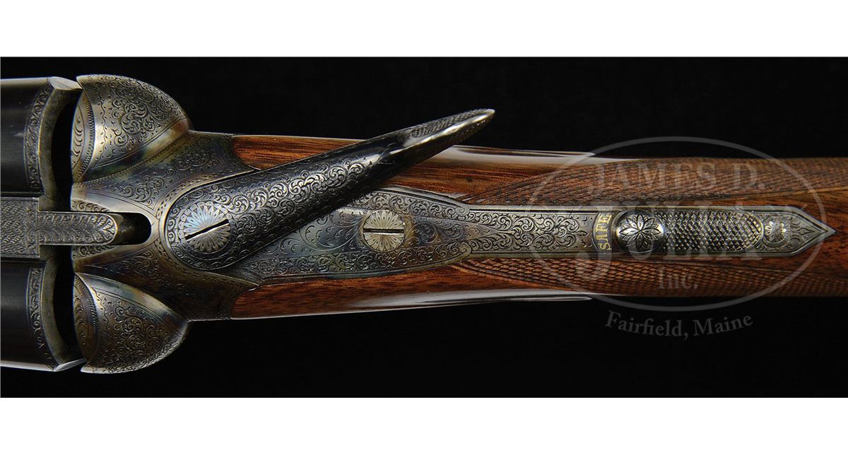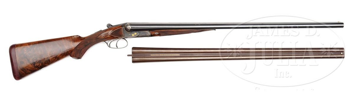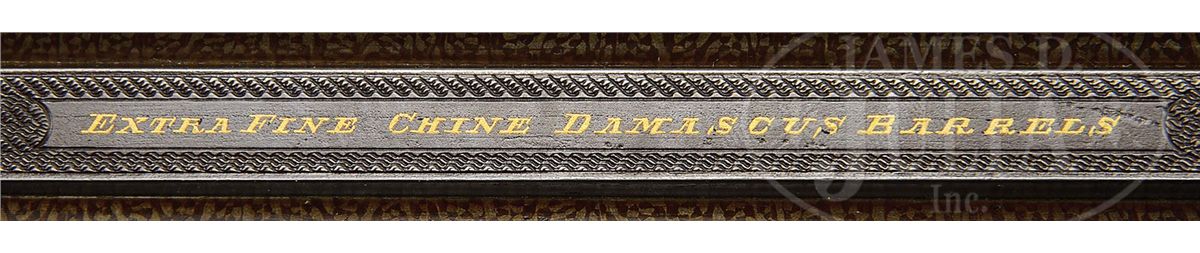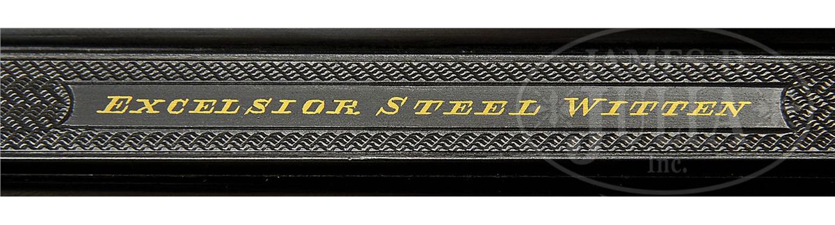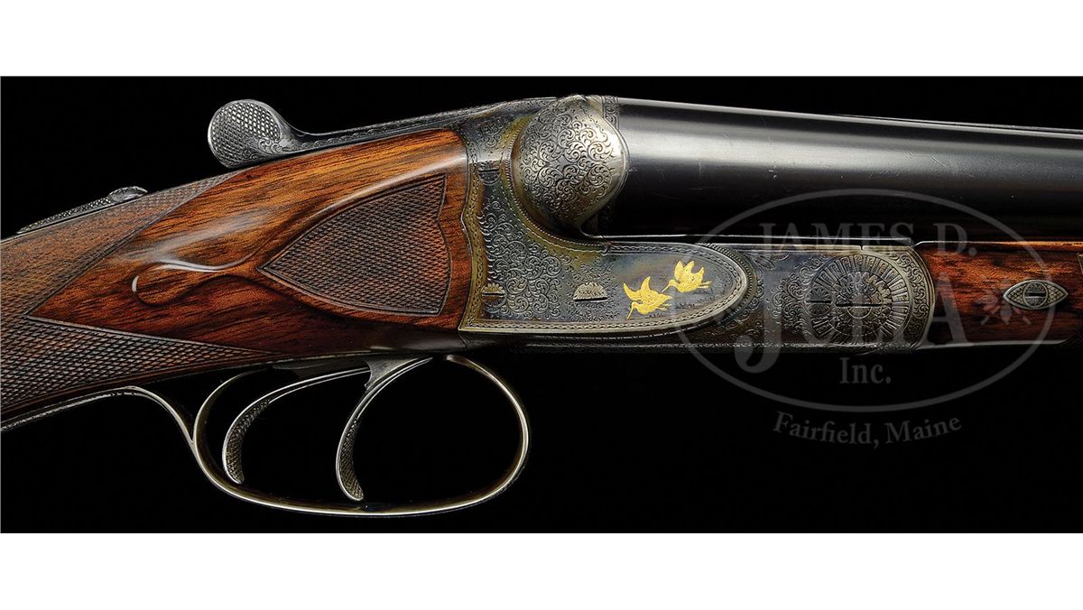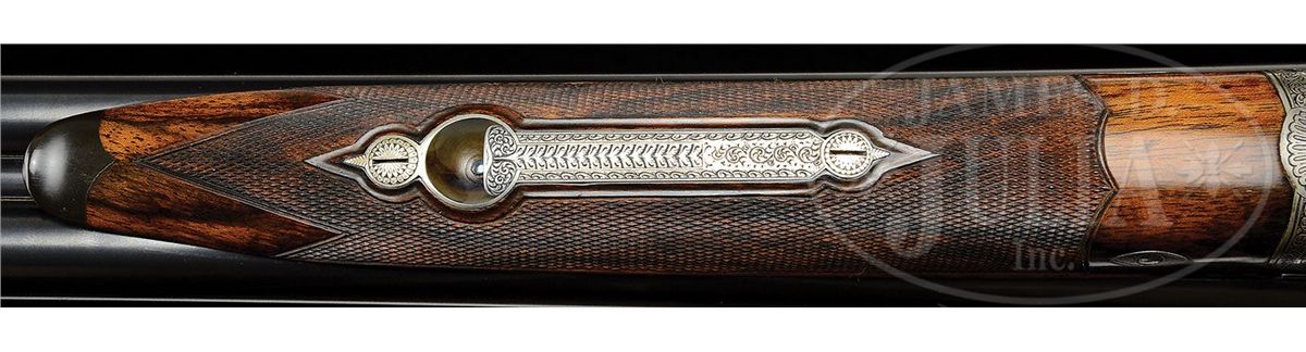 SN 1639. Cal. 16 ga. 2-3/4" Chambers on steel bbls and 2-1/2" chambers on Damascus bbls. 28" Steel and Damascus bbls. Both sets have flat matted pigeon ribs, German imperial black powder proofs on water tables, and "HAL" crossed pistol logos on bottoms. Steel bbls are gold inlaid "Excelsior Steel Witten" in unmatted portion on rib, and Damascus bbls: "Extra Fine Chine Damascus Barrels". Case hardened, scallop-backed boxlock action features side clips, square crossbolt third fastener, intercepting sears, and nickel-plated checkered double triggers. Action is nicely engraved with nearly 70% coverage small scroll. There are gold inlaid vignettes of game in appropriate backgrounds on action; a pair of quail on left, snipe on right, and cock black grouse in courting pose on bottom. A pointing setter is on trigger guard bow. Striking, burl figured European walnut full steel capped pistol grip buttstock measures 14-1/4" over maroon leather-covered pad, and features a vacant silver oval on toe line, point pattern checkering with line borders at grip, and checkered side panels with elongated teardrop points. Splinter ejector forend has scalloped horn tip and Deeley release. Steel bbls: Bore diameter: left-.667, right -.667. Bore restrictions: left -.007 (IC), right -.012 (Light mod). Wall thickness: left -.033, right -.034. Drop at heel: 2-15/16", drop at comb: 1-5/8". Weight: 6 lbs. 11 oz. LOP: 14-1/4". Damascus bbls: Bore diameter: left-.667, right -.667. Bore restrictions: left -.005 (IC), right -.010 (Lt mod). Wall thickness: left -.030, right -.032. Drop at heel: 2-5/16", drop at comb: 1-5/8". Weight: 6 lbs. 10 oz. LOP: 14-1/4". CONDITION: Excellent, as partially refinished. Steel bbls retain approx 95% of what appears to be orig blue, with some minor spots, mostly on right bbl, and slight silvering. Damascus bbls appear to have been re-browned, and retain essentially all of that brown. Action retains over 90% orig case hardening color, which is quite vivid where protected, pleasingly silvered on fences, beads, tangs, and at forend. Stocks retain nearly all of a glossy oil finish, with a few minor marks, checkering re-cut, forend slimmed at front. Pad is new. Steel bbl bores are excellent, bright and shiny throughout. Damascus bores are slightly pitted, and frosted. Action is loose with both sets of bbls, especially with forend removed. Ejectors are slightly out of time. 4-48995 MGM51