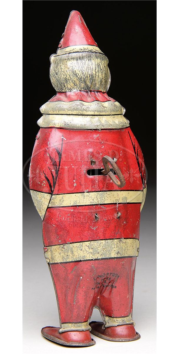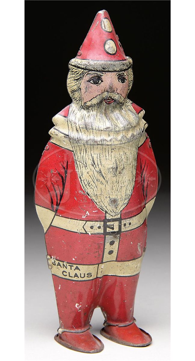 1920s all tin Santa Claus would vibrate about when wound. Nice early look on this scarce toy. SIZE: 7-1/2" t. CONDITION: Windup not working. Litho is good to very good. 1-13481