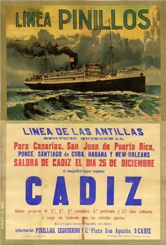 LINEA PINILLOS. VAPOR "CADIZ". 1916. 119,5x82cm. (47x32,2in.). Litografía. B+. Restos de cinta adhesiva en la parte inferior.
