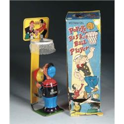 LINEMAR POPEYE BASKETBALL PLAYER W/ OB.  A spectacular all-original & near mint Popeye toy.  The box shows distress with a 3” x 2” piece detached from the lid but still present, however, the finely lithographed sides and original price tag (Newberry’s $.89) are still intact.  SIZE:  9”h.  CONDITION:  Overall condition near mint, scuff on right and left side where wrists hit torso.  JL 1-4550 (800-1,200)