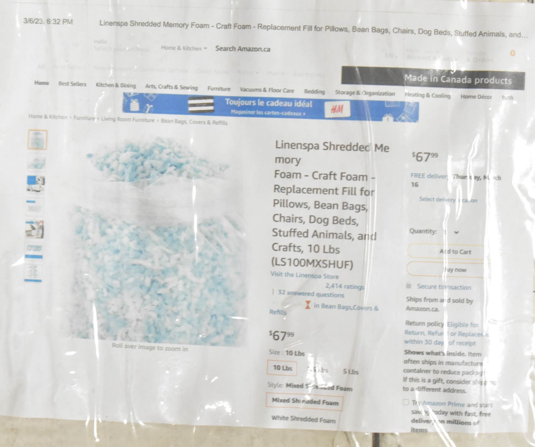 FOR PILLOWS, CHAIRS, DOG BEDS, STUFFED ANIMALS, CRAFTS AND MORE. RETAILS FOR $67.99 **ALL ITEMS MUST BE REMOVED BY 5PM SATURDAY, MARCH 25TH 2023. ALL REMAINING ITEMS WILL BE SUBJECT TO A $6.00 PER DAY STORAGE CHARGE. ANY ITEMS REMAINING AFTER MONDAY, APRIL 10TH, 2023 WILL BE CONSIDERED FORFEITED. NO REFUNDS WILL BE ISSUED FOR FORFEITED ITEMS. TO SCHEDULE A PICK UP APPOINTMENT CLICK HERE