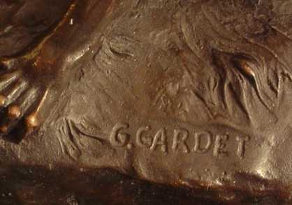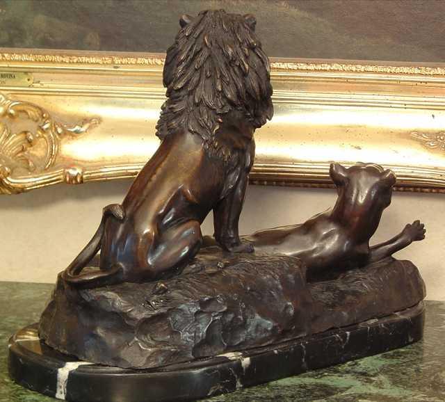 LION AND LIONESS BRONZE SCULPTURE BY GARDET - 12"H x 15"W x 8"D - VERY REALISTIC - GREAT DETAIL - MUSEUM BROWN PATINA - MOUNTED ON MARBLE