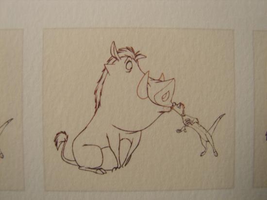 Featured here is a scene from "The Lion King" in which the famous spaghetti scene from "Lady and the Tramp" is recreated by Timon and Pumbaa, using a worm instead of spaghetti. Artists at the Walt Disney Studios Ink and Paint Department created this artwork based on background scenes from the film and original drawings. This print is from a Limited Edition of 500, and it includes a Disney embossed stamp in the lower right corner. The picture has reproductions of five character sketches on the bottom margin. This piece is framed in a black plastic coated frame.