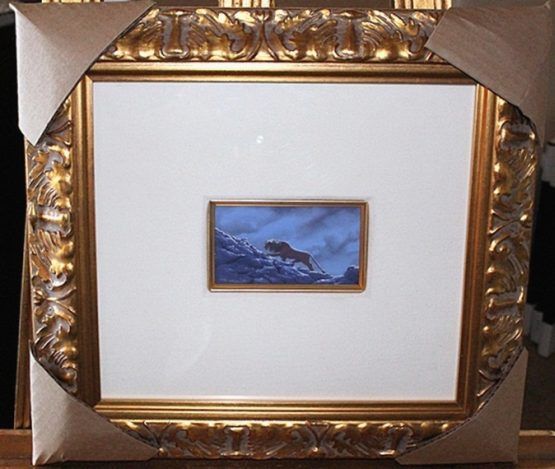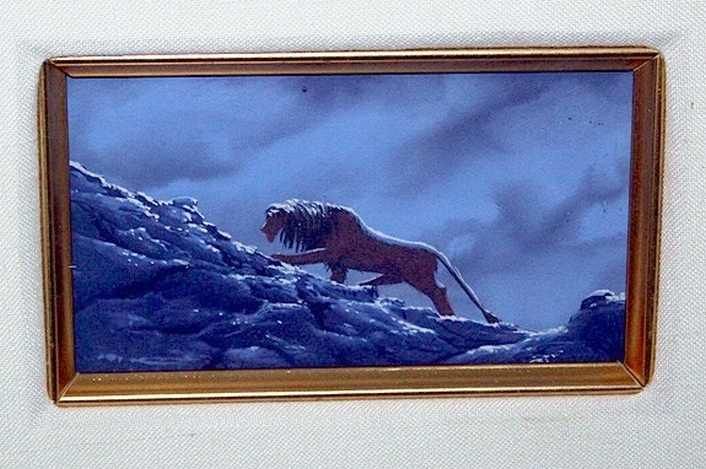 "LION KING" ORIGINAL COLOR KEY FROM DISNEY TOON STUDIOS 1994- "SCAR ON THE MOUNTAIN" - HAND DRAWN AND PAINTED BY FAMED DISNEY BACKGROUND ARTIST, WRITER & DESIGNER SERGE MICHAELS WHO PASSED AWAY IN 2009 - PROFESSIONALLY FRAMED AND MATTED - FRAMED 17.5" X 17.5" - IMAGE 3" X 6"