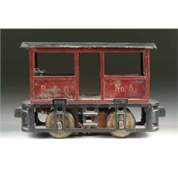 LIONEL 2 7/8 GAUGE #100 ELECTRIC LOCOMOTIVE WITH A DESIGNATION B. & O. #5. This is one of Lionel’s early pieces circa 1903. Tin body cast iron frame, black roof, dark maroon sides and end, lettered "B. & O. No. 5" on each side and "No. 5" on each end. Frame is black (alligatored). Marked "Lionel Manufacturing Co. N.Y." It has a miniature controller, which actually operates forward and reverse motion. Locomotive has a wonderful presence. CONDITION: There is some old time minor chipping. The metal framing around locomotive may have been touched up. One cast iron pin broken that holds body to frame, but does not affect visual appeal. Overall condition very good. EC 1-4346 (6,500-9,000)