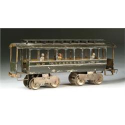 LIONEL #29 DAY COACH POWERED ON A #3 TROLLEY BODY. This trolley is very unusual and rare and a nice piece to put in anyone’s collection. Letter board on side of body reads "N.Y.C." and "H.R.R.R. Co." Also printed "#29" on dashboard and on both ends of the letterboard. Car is dark green. There are some original figures in the car of various conditions and there is a figure glued to the trolley car on one end. CONDITION: Overall appearance of this car is very good with occasional chipping and flaking. There is a hole in the middle of the roof approximately 1/4” in diameter. Coupler missing on one end and possibly replaced coupler on the other end. Condition of lettering on both sides is very good. EC 1-4342 (3,500-5,200)