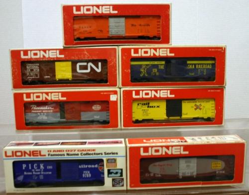 LIONEL 9700 SERIES BOX CARS. CN, ALASKA, RIO GRANDE, RAILBOX, PACEMAKER, PICKENS, CENTRAL OF GEORGIA, L&N.