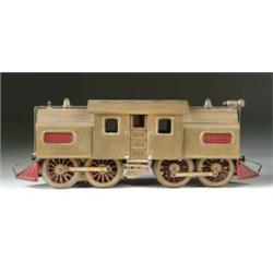 LIONEL BRASS #54 SINGLE MOTOR. Thick rim wheels, all brass body, pedestal head light, screens and trim are in red. This model has screens in each end of cab painted in red. CONDITION: Steps are intact but have been re-soldered. Two very minute dings that are barely visible in roof; otherwise body is in very nice condition. EC 1-4349 (1,600-2,400)