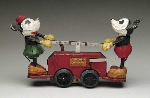 LIONEL MICKEY MOUSE AND MINNIE HANDCAR. Large composition Mickey and Minnie Mouse with a red handcar. When wound-up Mickey and Minnie work the handcar as it moves along the track. SIZE: 9-1/4" l CONDITION: Mickey and Minnie's legs professionally replaced. Overall wear to handcar and figures. Otherwise in good condition. 1-5196 MC