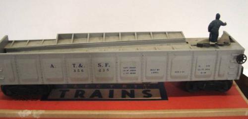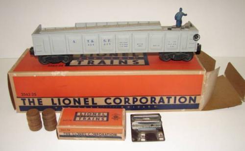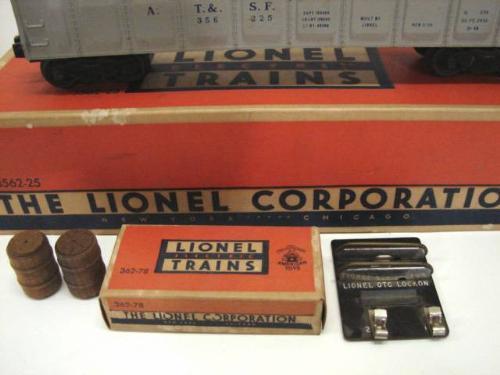 LIONEL NO. 3562 OPERATING BARREL CAR WITH BOX. Box is in very good condition. Car is marked "A.T. & S.F./356225". Box has two loose barrels. Also comes with one Lionel No. 362-78 Six Barrel box and barrels (has all 6 barrels.