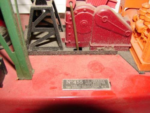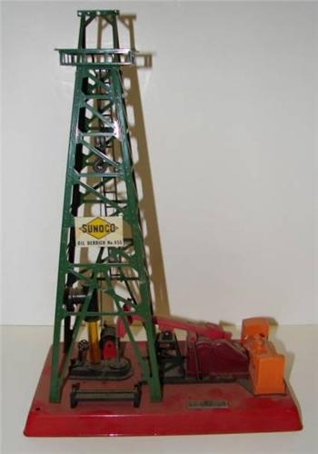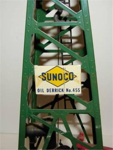 LIONEL NO. 455 OIL DERRICK AND PUMPER. Missing box. Tower is marked with Sunoco/Oil Derrick No. 455 sign.