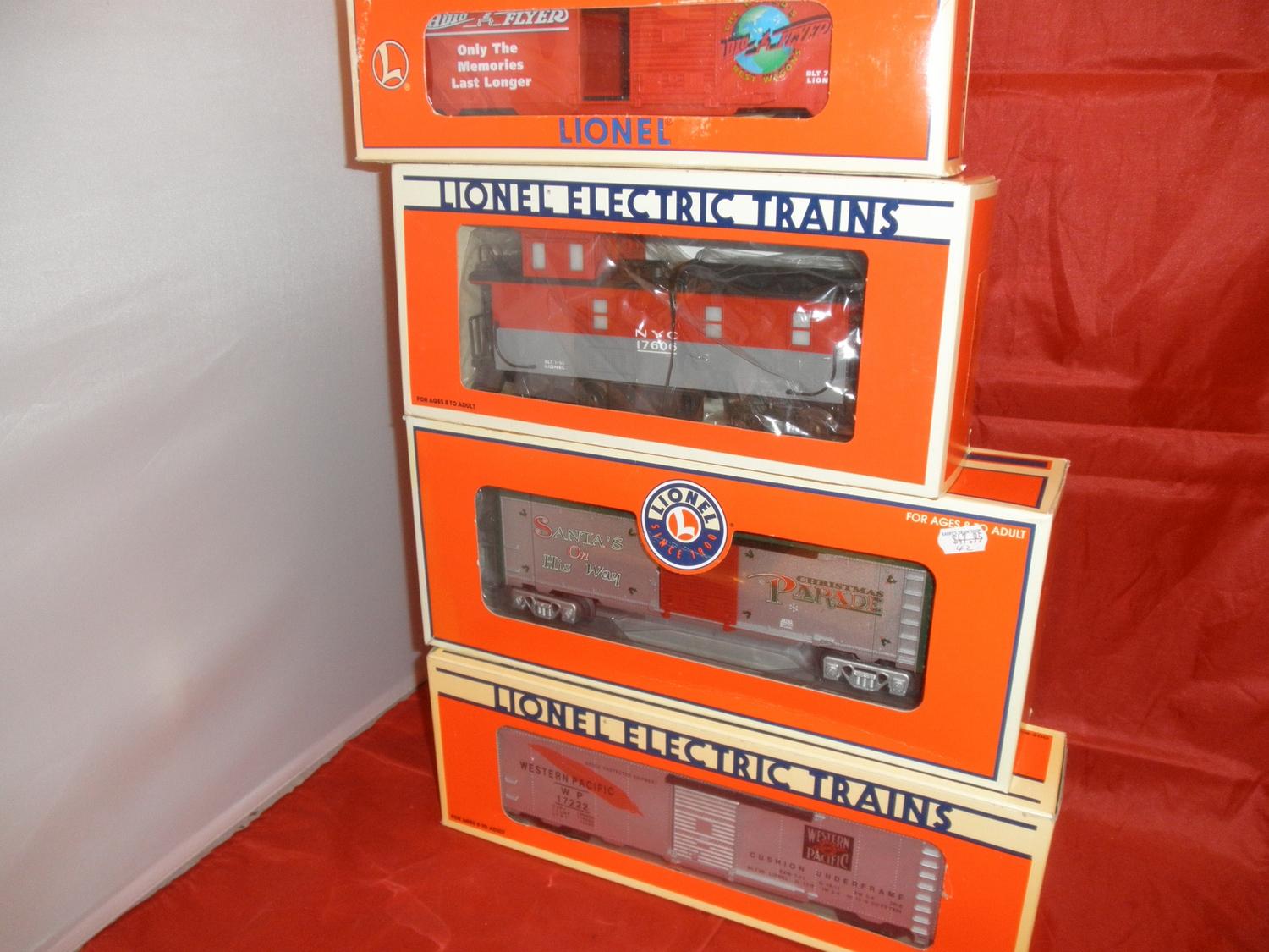 Four (4) Lionel O gauge freight cars in the original boxes. #16275 Eastwood Radio Flyer box car, 17606 NYC smoking caboose, #36743 Santa Claus bobbing head box car, #17222 Western Pacific box car.