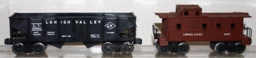 LIONEL O GAUGE L.V. HOPPER (BLACK), LL SP TYPE CABOOSE (PTD. BROWN).