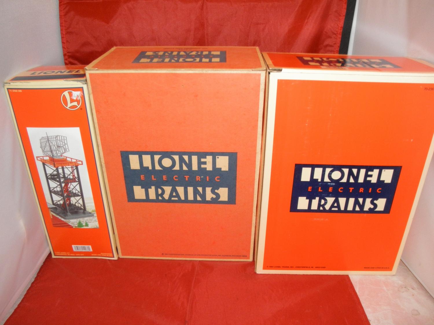 Three (3) Lionel O gauge operating accessories in the original boxes. #12960 Rotary Radar Antenna, #2305 Oil Derrick and Pump, #12848 Oil Derrick.