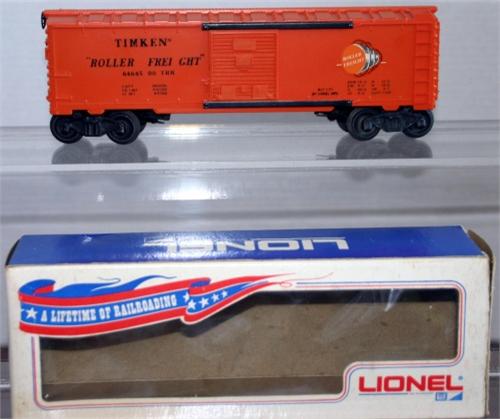 LIONEL ORANGE TIMKEN BOX CAR. CAR MADE FOR LIONEL DEALER GLEN UHL. CAR HAS SMALL CRACK AT SCREW HOLE DUE TO BODY BEING LONGER THAN FRAME. BOX HAS TORN FLAP. CAR HAS NOT BEEN RUN.