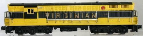 LIONEL POST WAR VIRGINIAN FM. BLACK & GOLD. DUAL MOTORS, LIGHT, MT, HORN. NO BATTERY DAMAGE. SCREW HOLE CRACKS BOTH ENDS.
