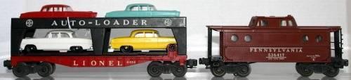 LIONEL POSTWAR 6414 AUTO LOADER WITH REPODUCTION AUTOS. 6417 PENN. N5C CABOOSE.