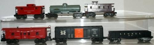 LIONEL POSTWAR BAY WINDOW CABOOSE + 5 ADDITIONAL POSTWAR FREIGHT CARS.
