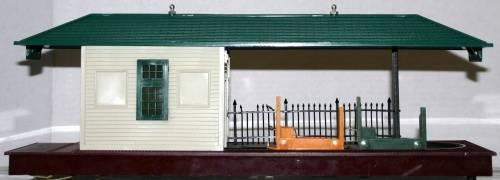 LIONEL POSTWAR OPERATING FREIGHT STATION. MISSING DECALS, AND FENCE SIGNS.