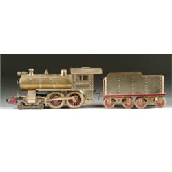 LIONEL STANDARD GAUGE BRASS AND NICKEL #7. Locomotive with matching tender create this lot of two and both are brass and nickel plated; locomotive has brass boiler with nickel plated cab and tender is nickel finish with red trim along base, wheels, and inside coal pocket area. CONDITION: Beautiful locomotive with nice patina. EC 1-4356 (2,000-3,000)