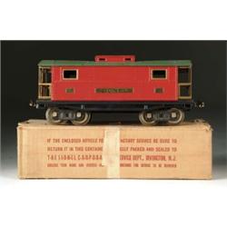 LIONEL STANDARD GAUGE CABOOSE #217. Car features red cupola, green roof and bright red body on black base. Original box is included completely intact, rubber-stamped #217. CONDITION: Near excellent plus, beautiful paint with very few minute chips. EC 1-4381-1221 (300-500)