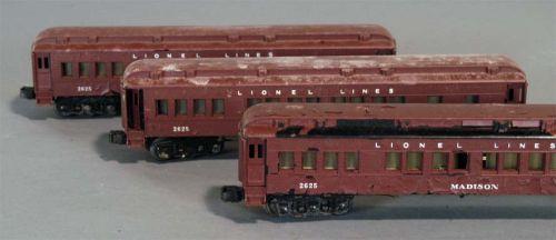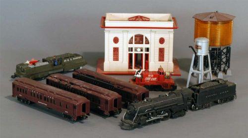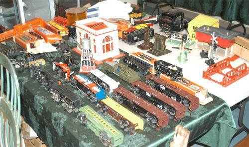 LIONEL TRAIN COLLECTION, contents of two tables together with boxes and track underneath, includes #115 station, Irvington cars (3), #52 fire car, 226e engine, 2332 electric. Condition varies, some paint flaking, SHIPPING: See recommended third party sh