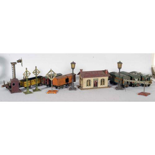 LIONEL TRAINS AND ACCESSORIES 607,607, 608 passenger cars, Lioneltown Station and several signs CONDITION REPORT: considerable paint loss to station, remainder showing wear from use. PACKING AND SHIPPING: We offer packing (double boxed in most cases) and shipping of this item within the Continental United States by USPS or UPS (our choice- boxes over 30lbs or oversized may be recalculated based on buyer's location), NOT INCLUDING INSURANCE (it will be added when we know the sales price) for $40
