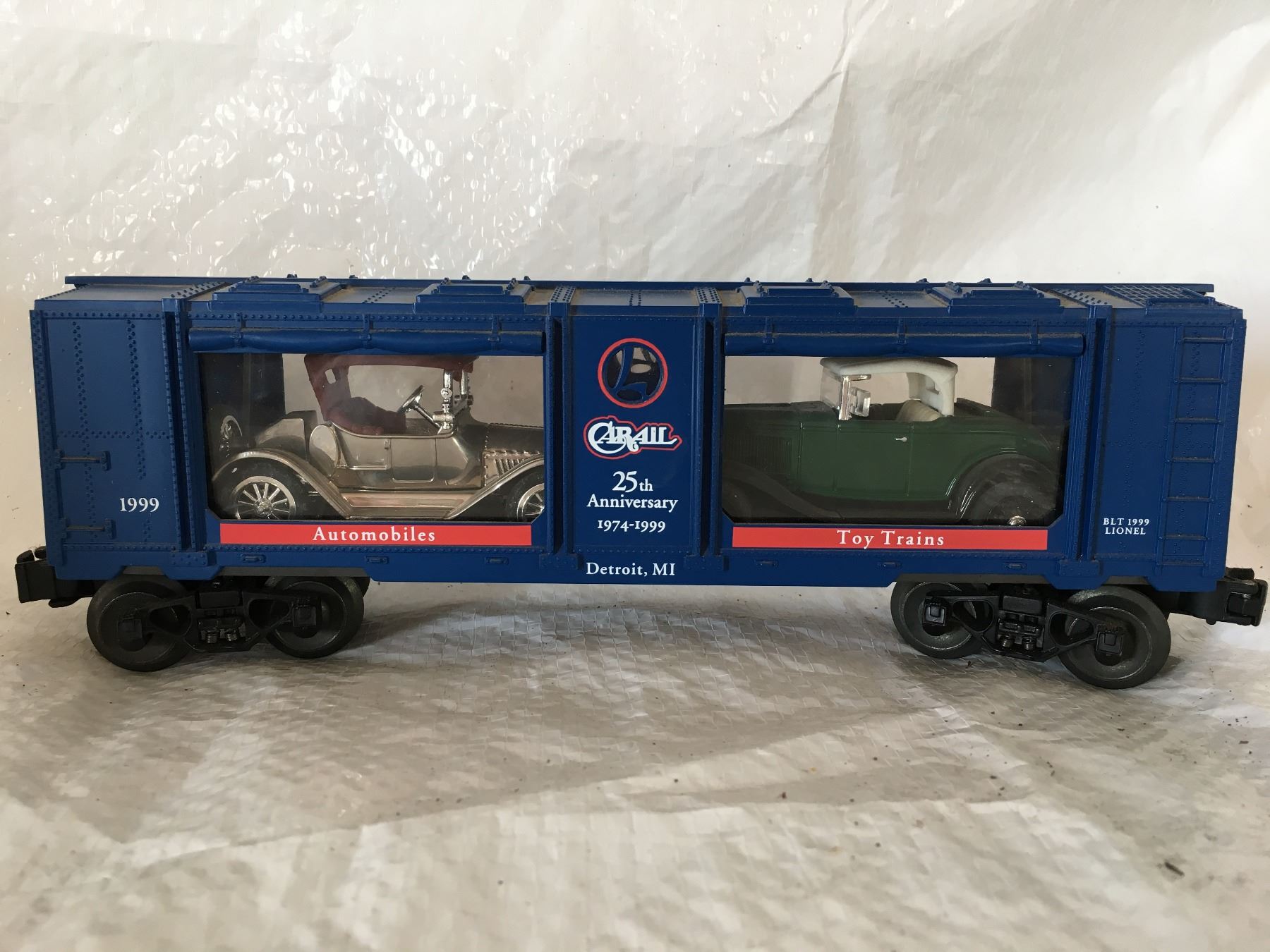 TRAIN BOX CAR W/ 2X FORD MODEL T CARS. CARAIL 25TH ANNIVERSARY, 1974-1999. CONDITION: VG